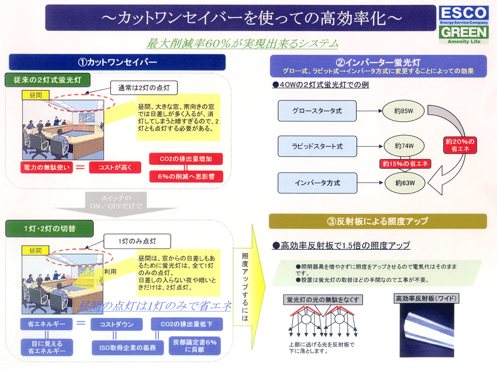 ◆省エネ、環境改善にも貢献▼カットワンセイバーの特徴【1】60%以上の省エネ実現。 【2】インバーター蛍光灯で20%の省エネ。 【3】スイッチで1灯と2灯の切り替えが可能。 【4】CO2→年間40Wで43kg110Wで108kgの削減可能。 【5】省エネ法をすべてクリアした製品。 【6】窓の多いフロアでの昼間の無駄な電力をカット。 【7】誰でもわかる確実な、CO2削減、コスト削減効果。 ・安定器のみ交換 銅鉄安定器又電子安定器が交換時期の場合おすすめします。 ※家庭用サークルラインと同じ感覚で自由に1灯2灯が選択出来る。 ・器具ごと交換 新設又既設器具全体の劣化の場合おすすめします。 ※反射板をプラスで明るさは確保。 ・キャノピースイッチ 現状キャノピースイッチを使用又必要な場合おすすめします。 ※安定器の交換、スイッチの装置の配線工事のみ。 ※スイッチは既存のまま。 |